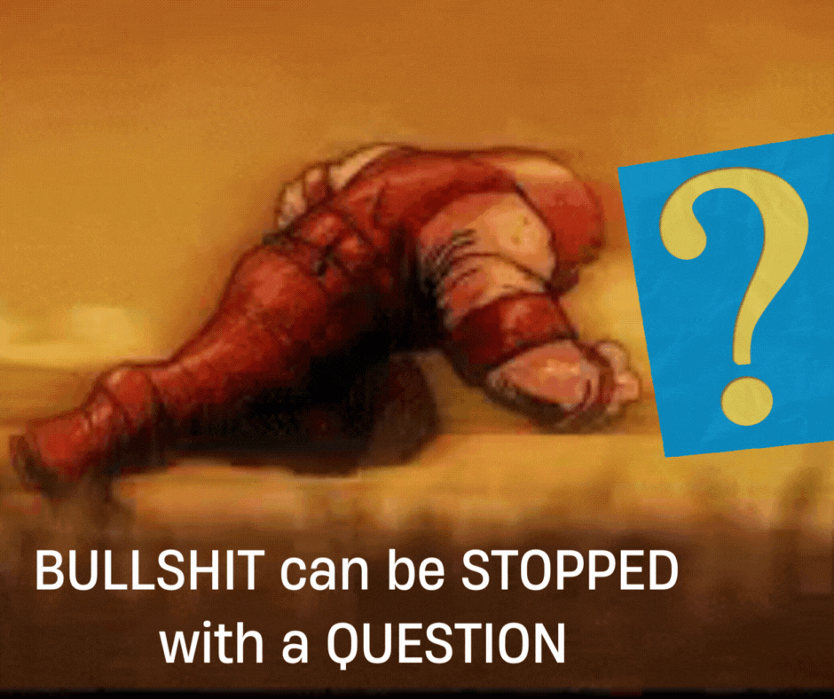 I think bullshit is like a nonstop Juggernaut train. You know, that X-Men character that, once he gets going, he can never stop. And his head kind of looks like a penis? That's what it's like. It sounds like training until someone's like, "Huh? But wait.” Bullshit can be stopped with a question.